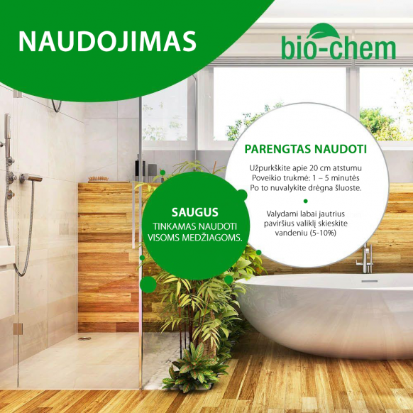 Naudojimas: užpurkškite ant valomo paviršiaus iš maždaug 20 cm atstumo. Trumpam palikite veikti po to nuvalykite drėgna šluoste. Jei valote įsisenėjusias kalkes, veikimo laiką padidinkite iki 5 minučių.